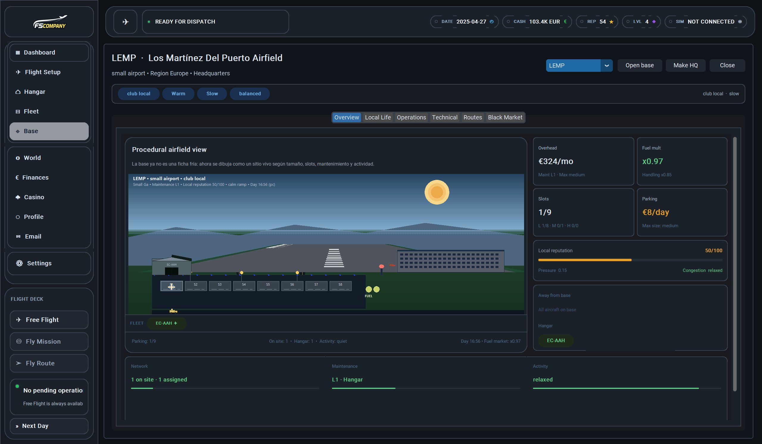 Vista procedural de tu aeródromo con slots, hangar, fuel y actividad. Tabs: Overview, Local Life, Operations, Technical, Routes, Black Market.