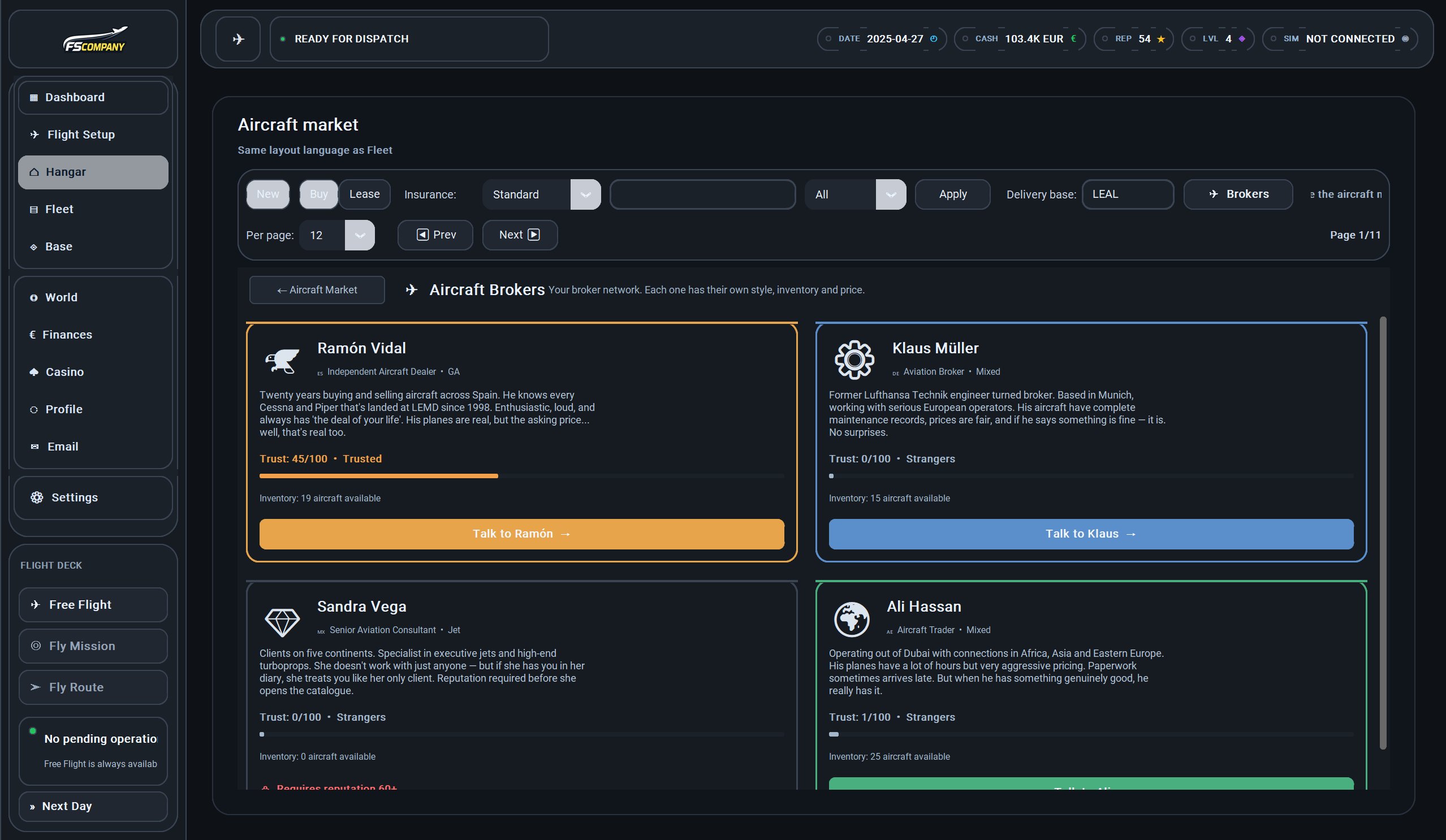 Cada aeronave tiene su propia ficha de estado. Los brokers tienen carácter, inventario y precios muy distintos entre sí.