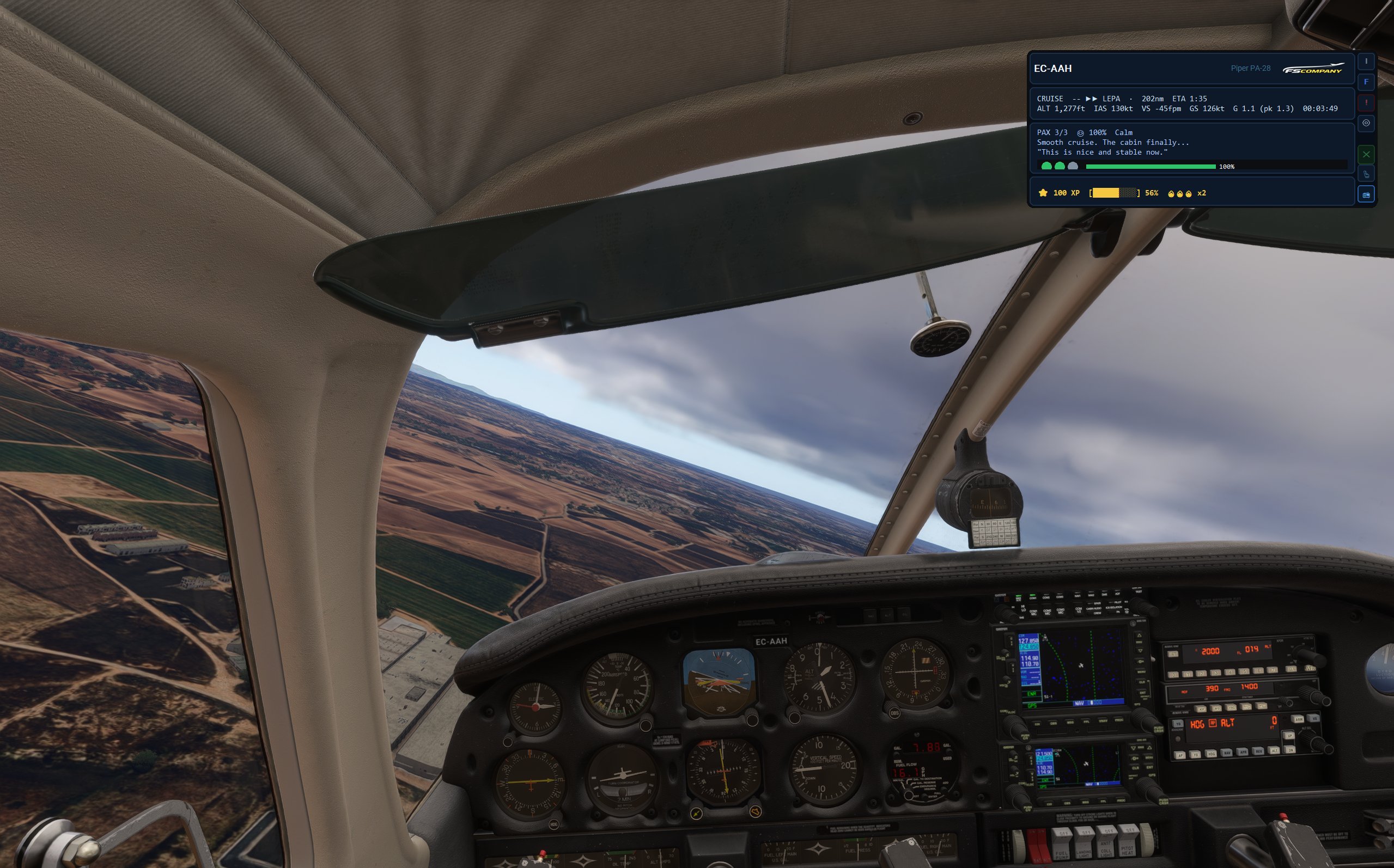 Una vez en el aire, FSCompany aparece como un HUD discreto pero completo. Tus pasajeros reaccionan, tus XP suben y la radio de cabina suena. Cada vuelo es una historia diferente.