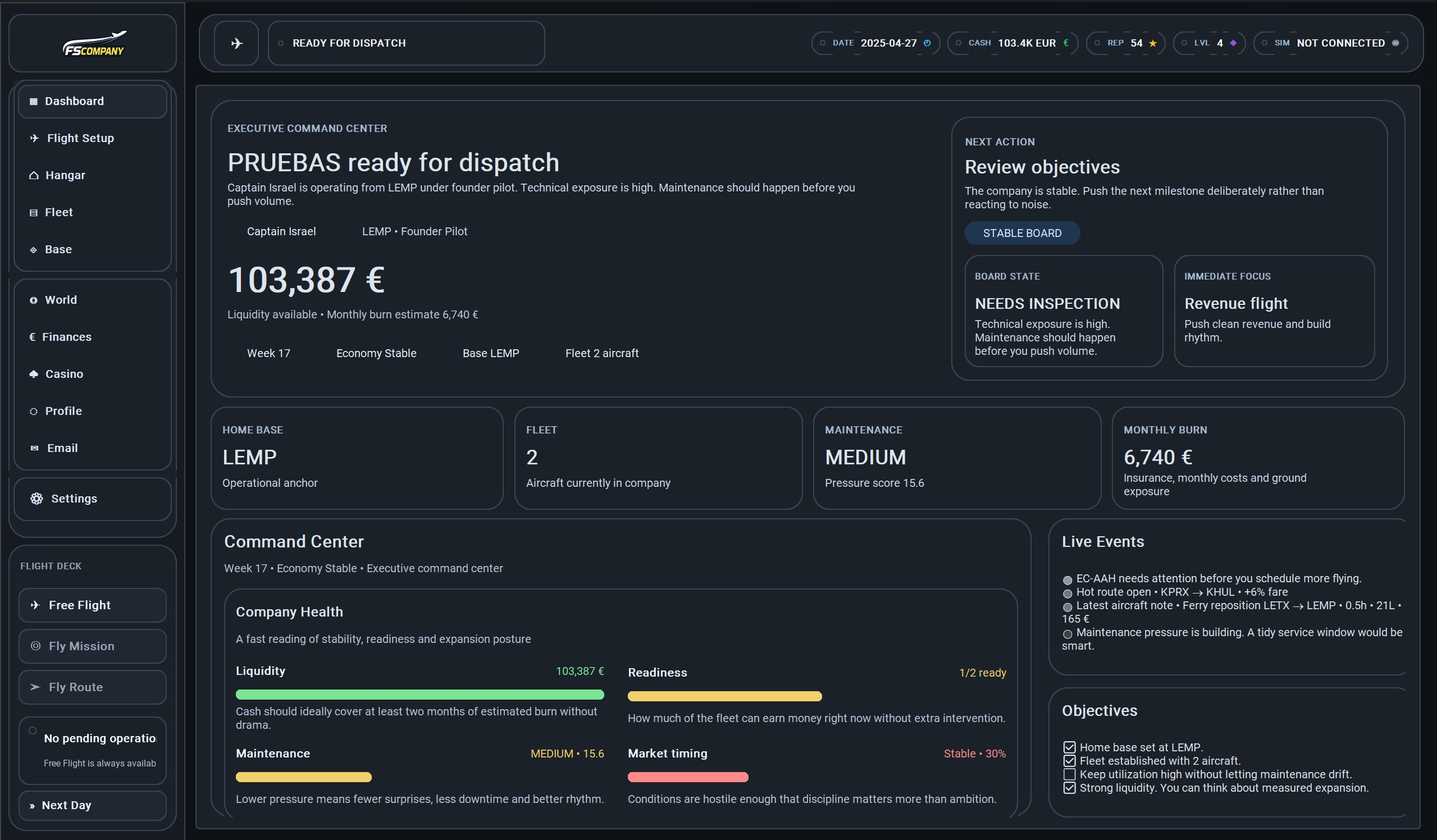 Liquidez, estado de flota, mantenimiento, burn mensual y eventos en vivo. Objetivos que se marcan según avanzas.