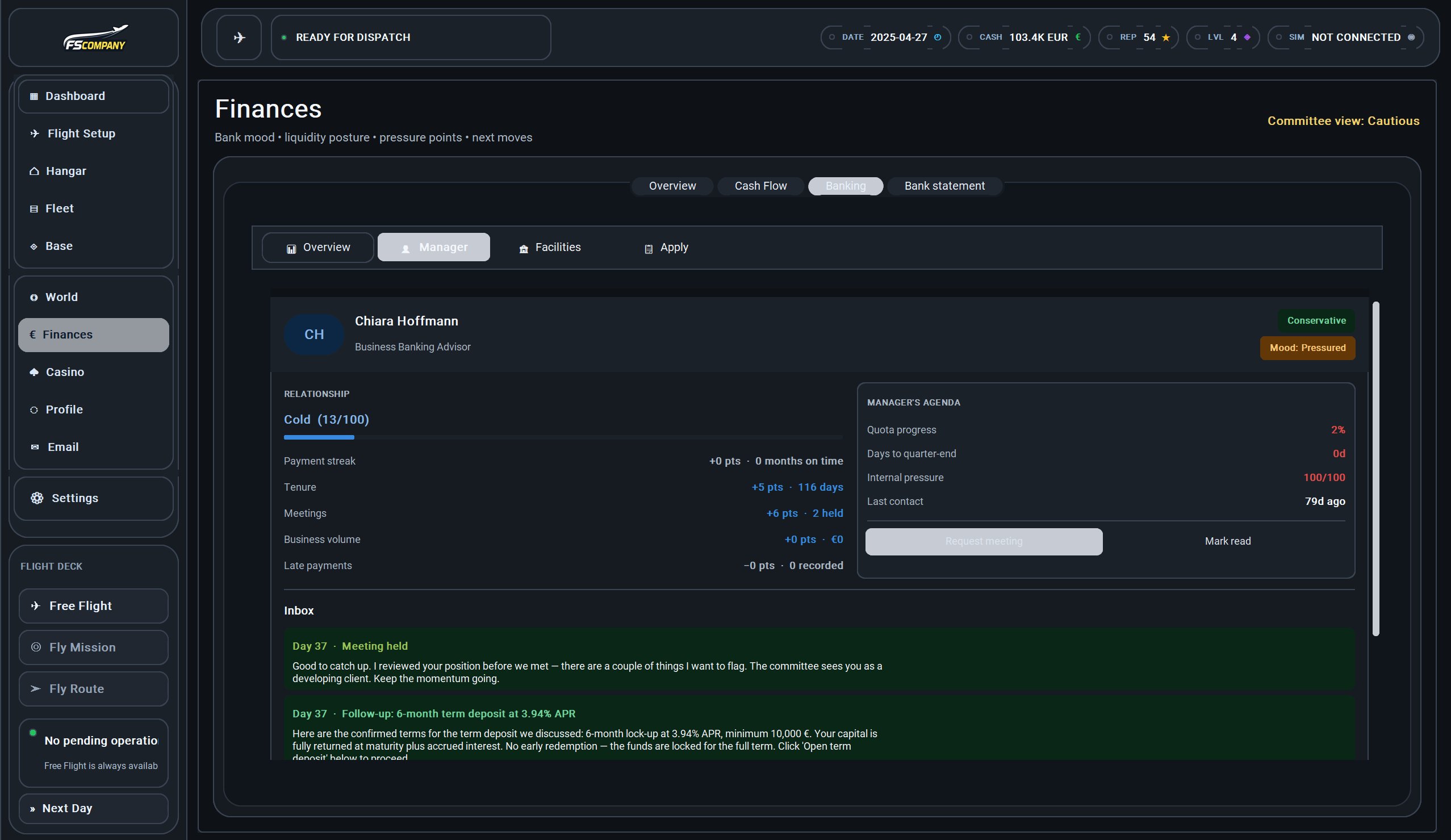 Chiara Hoffmann. Cold relationship (13/100), mood "Pressured". Request meetings, manage term deposits at 3.94% APR.
