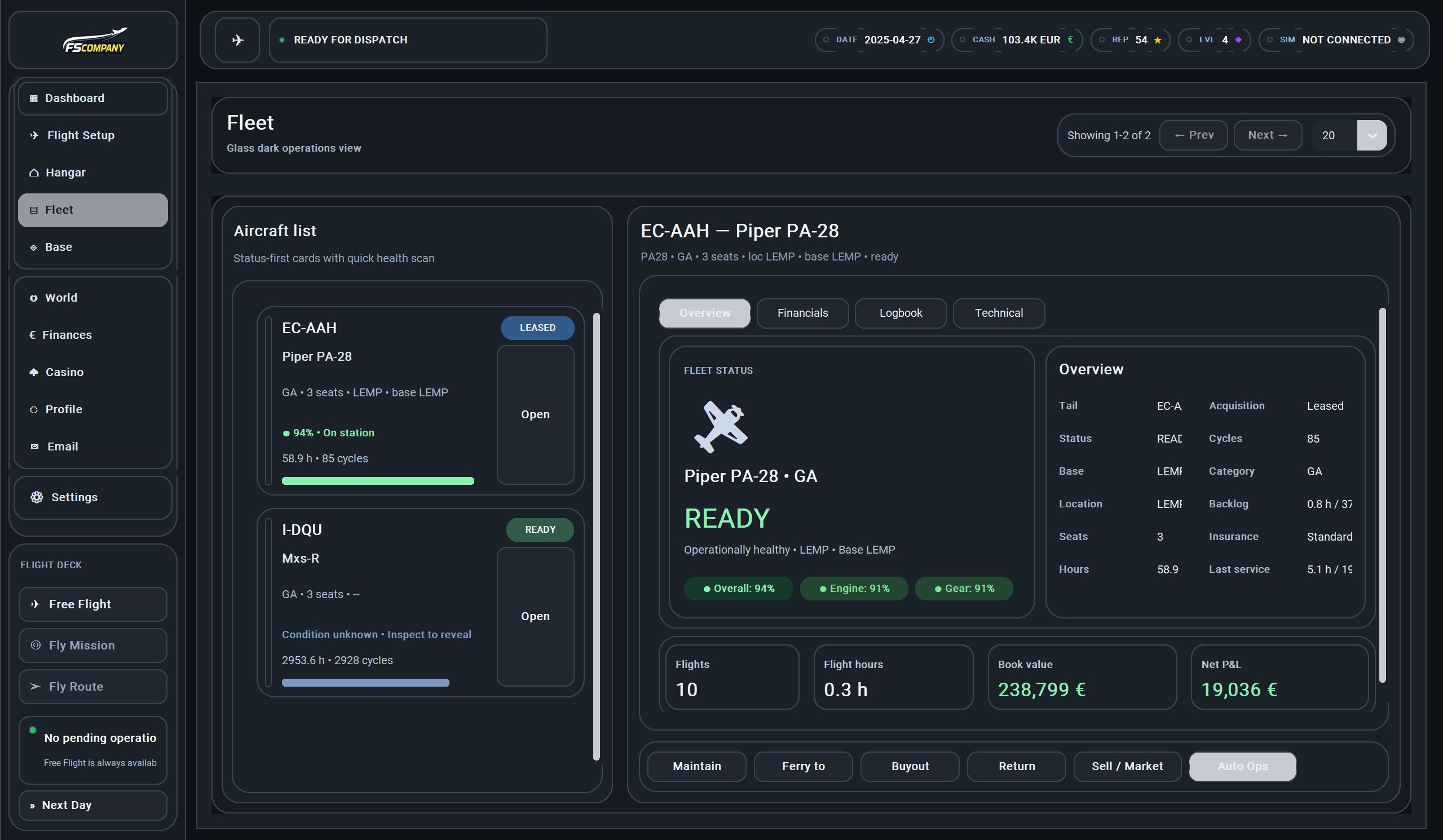 Every aircraft has a full profile: health (94%), engine (91%), gear (91%), cycles, hours, logbook and net P&L. Maintain, ferry, buy out or sell to market.