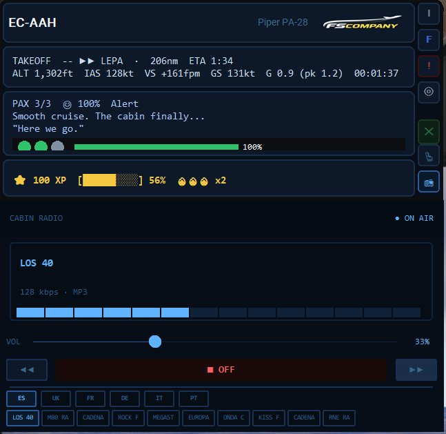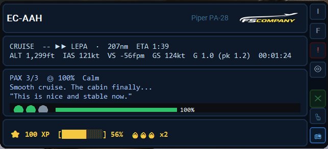 Once airborne, FSCompany appears as a discreet but complete HUD. Your passengers react, your XP increases and the cabin radio plays. Every flight tells a different story.